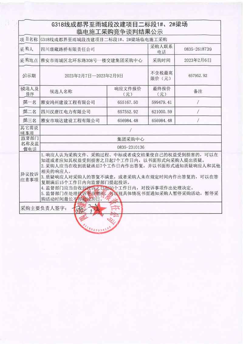 四川康藏路橋有限責任公司G318線成都界至雨城段改建項目二標段1#、2#梁場臨電施工采購競爭談判結果公示