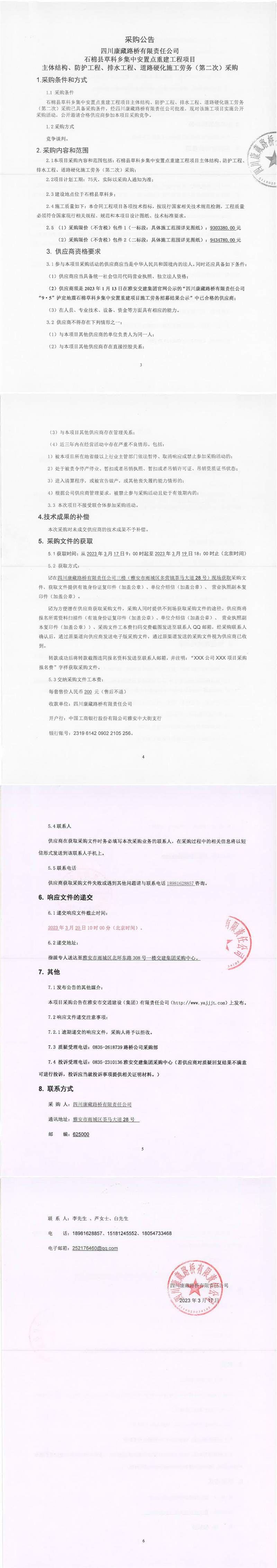 四川康藏路橋有限責(zé)任公司石棉草科鄉(xiāng)集中安置點(diǎn)重建工程項(xiàng)目主體結(jié)構(gòu)、防護(hù)工程、排水工程、道路硬化施工勞務(wù)(第二次)采購公告