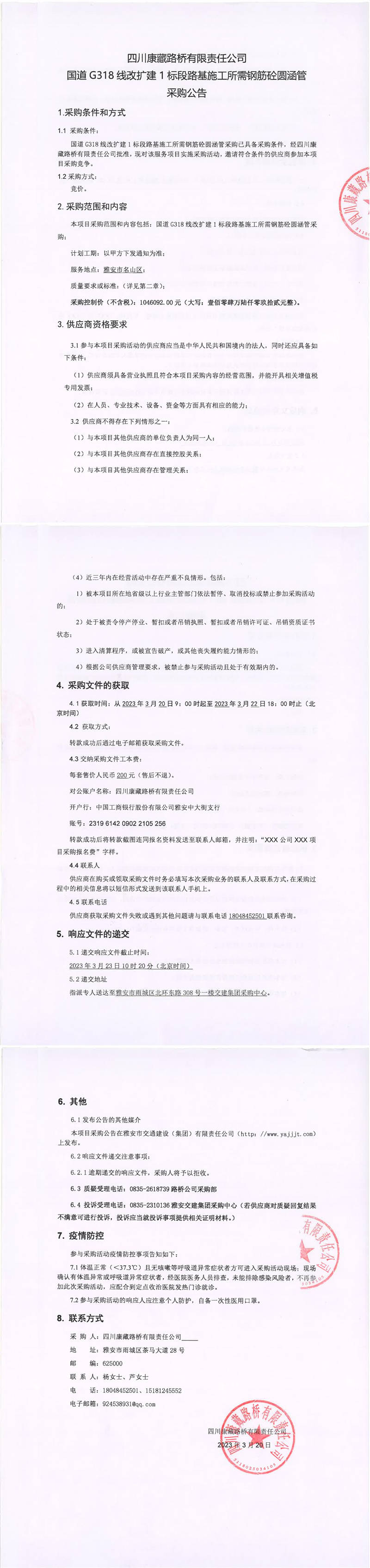 四川康藏路橋有限責任公司國道G318線改擴建1標段路基施工所需鋼筋砼圓涵管采購公告