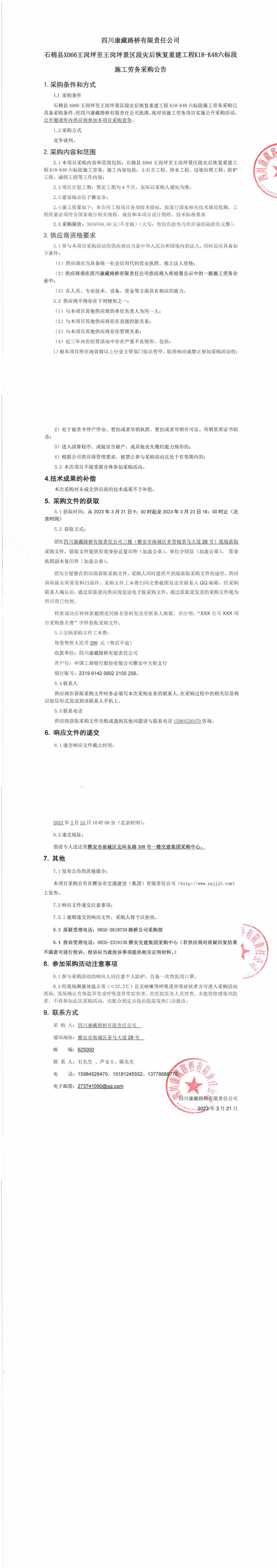 四川康藏路橋有限責(zé)任公司石棉縣X066王崗坪至王崗坪景區(qū)段災(zāi)后恢復(fù)重建工程K18-K48六標(biāo)段施工勞務(wù)采購公告