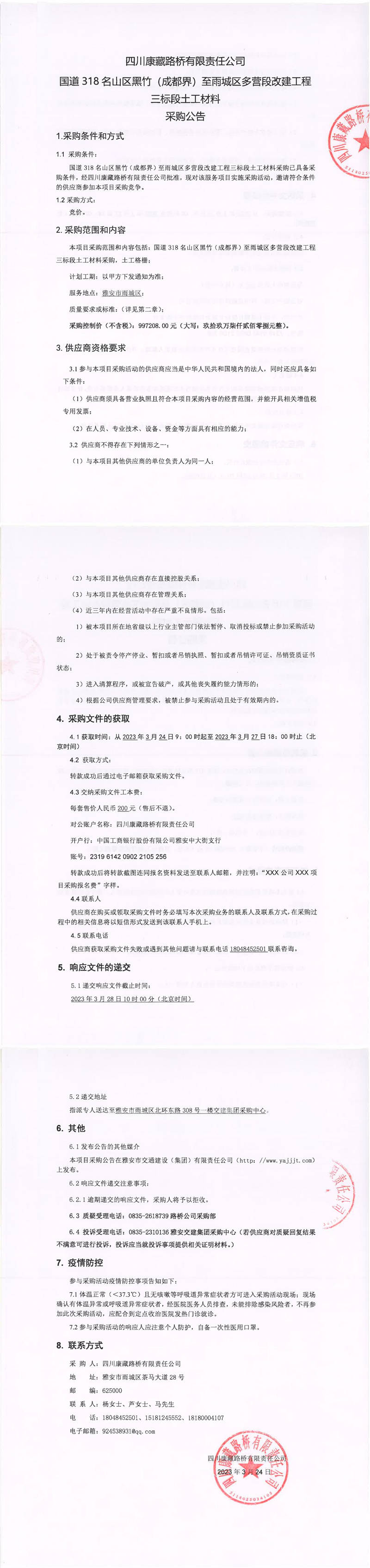 四川康藏路橋有限責(zé)任公司國道318名山區(qū)黑竹(成都界)至雨城區(qū)多營段改建工程三標段土工材料采購公告