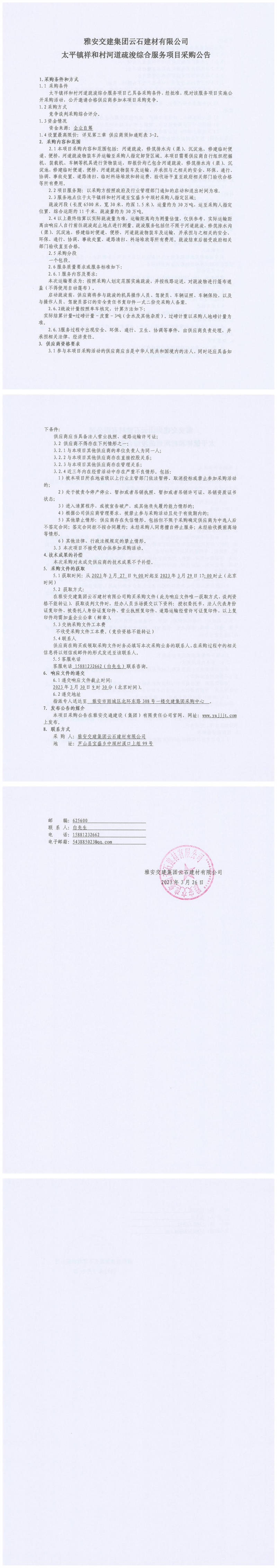 雅安交建集團云石建材有限公司太平鎮(zhèn)祥和村河道疏浚綜合服務項目采購公告