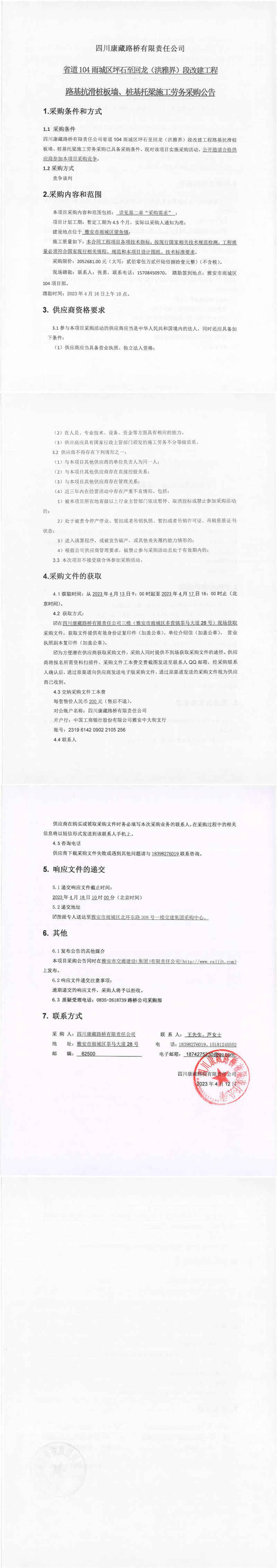 四川康藏路橋有限責(zé)任公司省道104雨城區(qū)坪石至回龍(洪雅界)段改建工程路基抗滑樁板墻、樁基托梁施工勞務(wù)采購公告