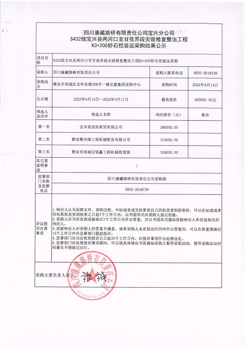 四川康藏路橋有限責(zé)任公司寶興分公司S432線寶興縣兩河口至甘孜界段災(zāi)毀修復(fù)整治工程K0+200砂石挖裝運(yùn)采購結(jié)果公示
