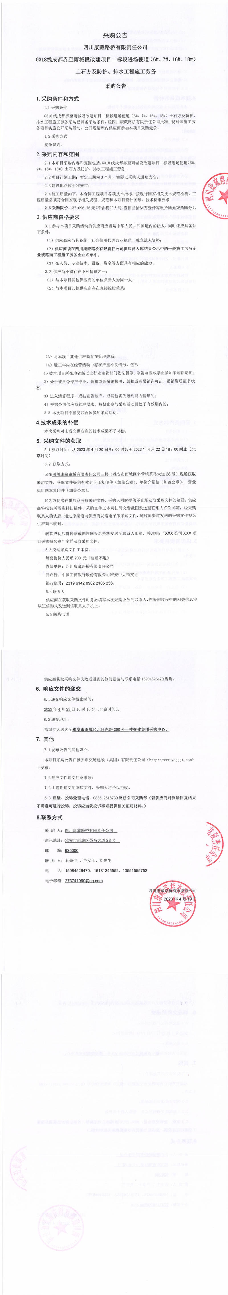 四川康藏路橋有限責(zé)任公司G318線成都至雨城段改建項目二標段進場便道(6#、7#、16#、18#)土石方及防護、排水工程施工勞務(wù)