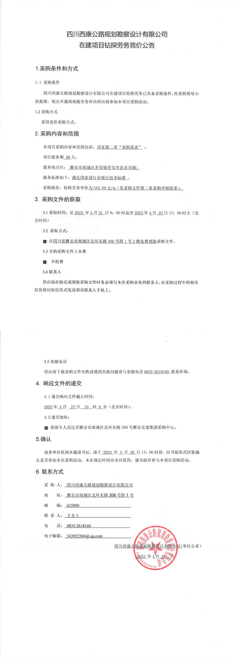 四川西康公路規(guī)劃勘察設計公司在建項目鉆探勞務競價公告