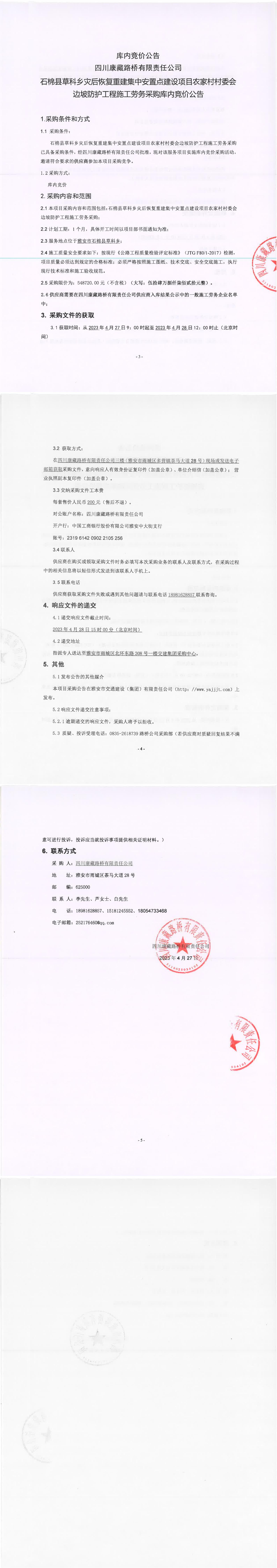 四川康藏路橋有限責(zé)任公司石棉草科鄉(xiāng)災(zāi)后恢復(fù)重建集中安置點(diǎn)建設(shè)項(xiàng)目農(nóng)家村村委會(huì)邊坡防護(hù)工程施工勞務(wù)采購采購庫內(nèi)競價(jià)公告