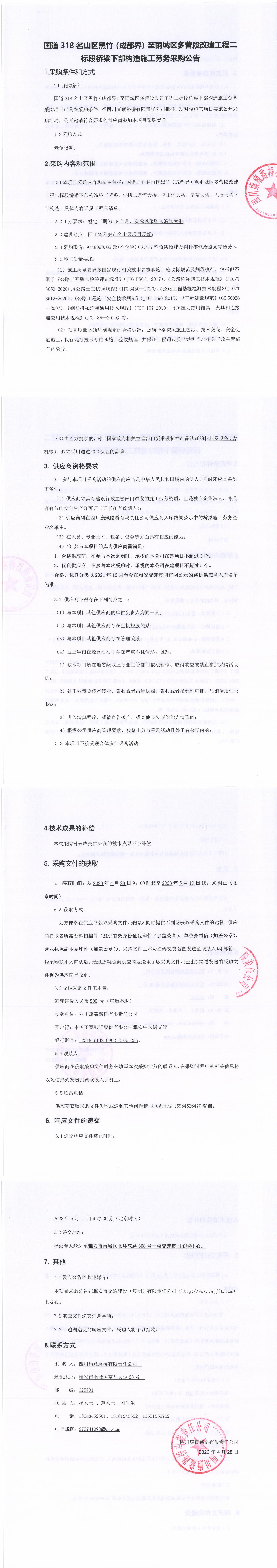 四川康藏路橋有限責任公司國道318名山區(qū)黑竹(成都界)至雨城區(qū)多營段改建工程二標段橋梁下部構造施工勞務采購公告