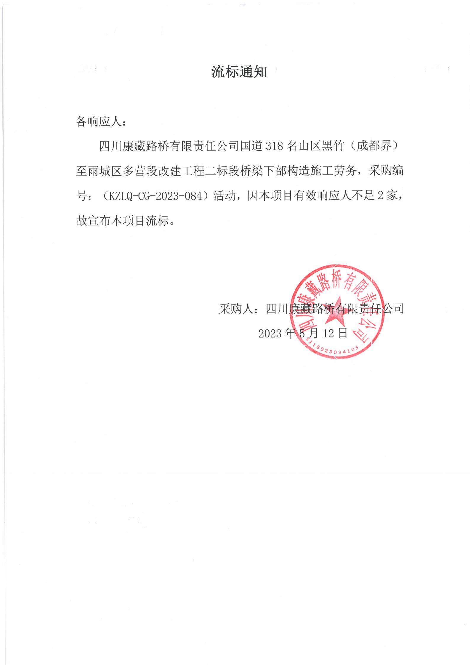 四川康藏路橋有限責(zé)任公司國道318名山區(qū)黑竹(成都界)至雨城區(qū)多營段改建工程二標(biāo)段橋梁下部構(gòu)造施工勞務(wù)流標(biāo)通知