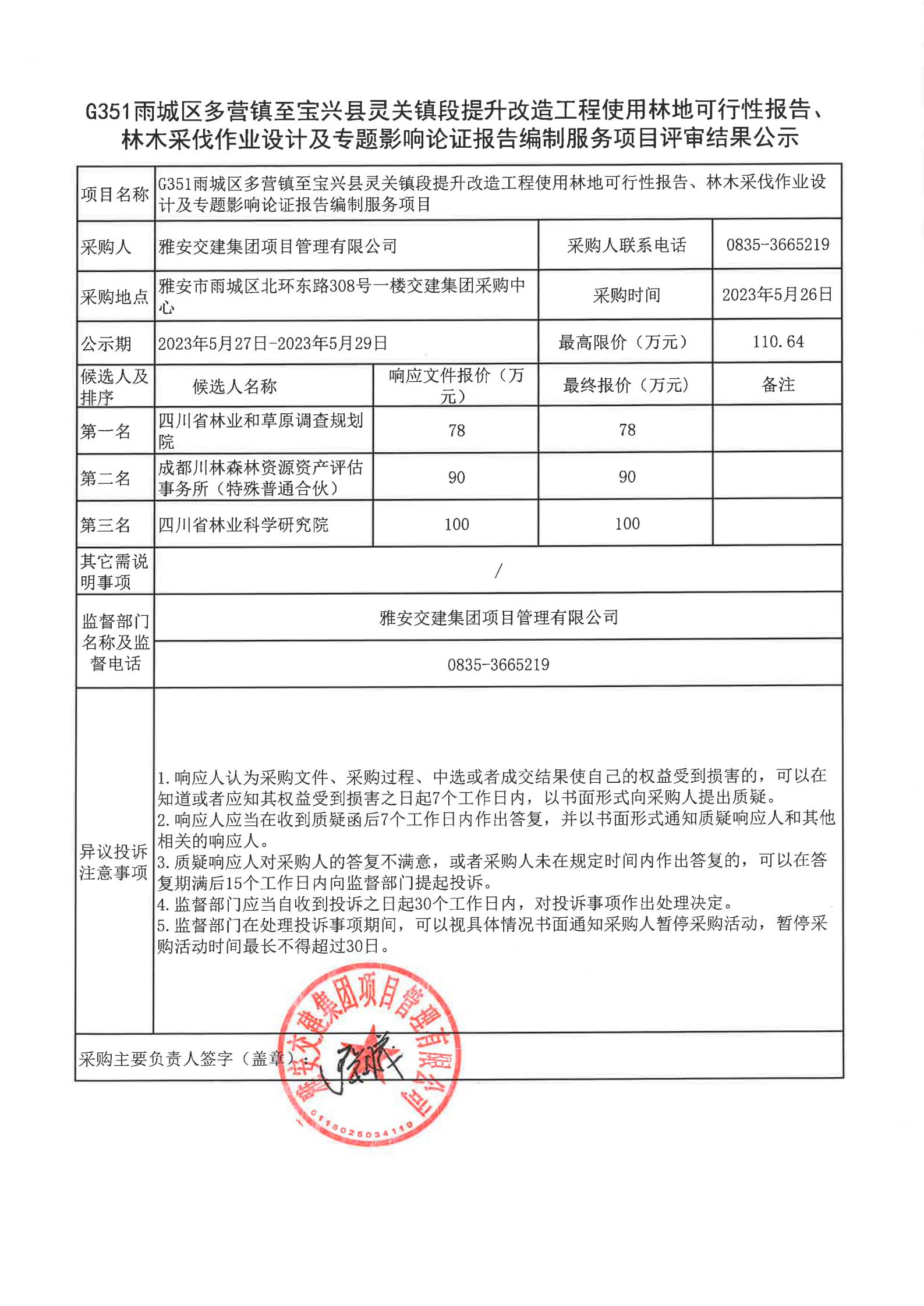 雅安交建集團(tuán)項(xiàng)目管理有限公司G351雨城區(qū)多營鎮(zhèn)至寶興縣靈關(guān)鎮(zhèn)段提升改造工程使用林地可行性報(bào)告、林木采伐作業(yè)設(shè)計(jì)及專題影響論證報(bào)告編制服務(wù)項(xiàng)目評審結(jié)果公示