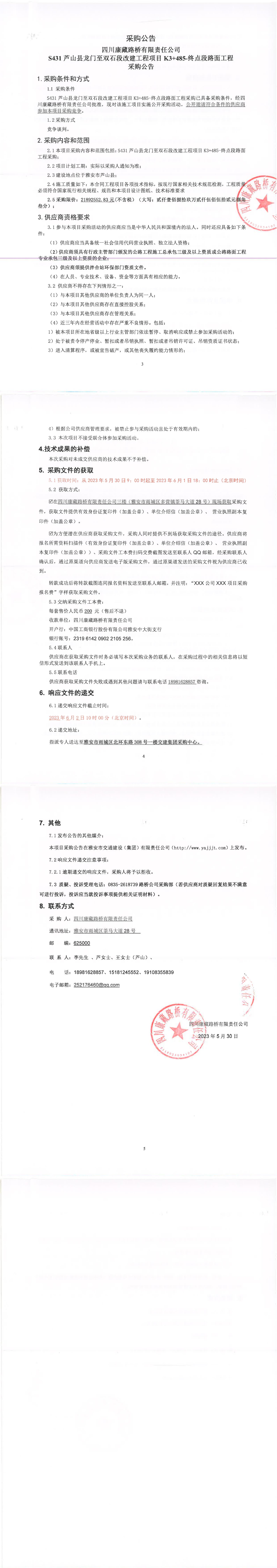 四川康藏路橋有限責(zé)任公司S431蘆山縣龍門(mén)至雙石段改建工程項(xiàng)目K3+485-終點(diǎn)段路面工程采購(gòu)公告