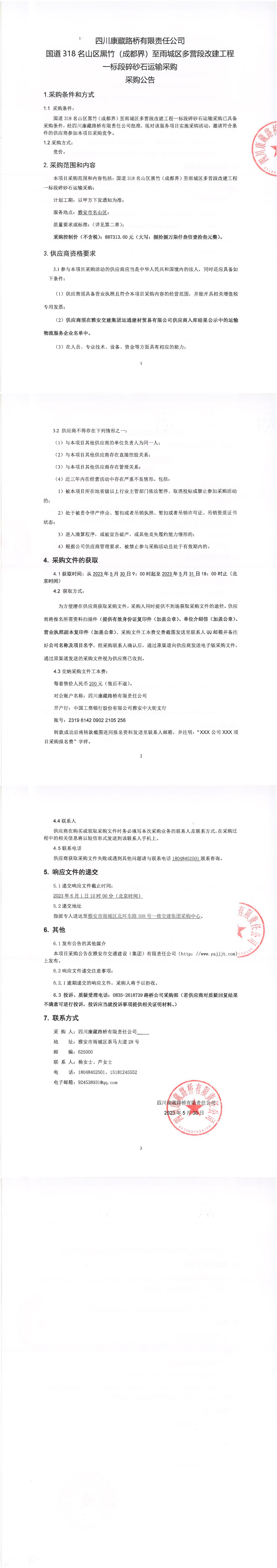 四川康藏路橋有限責任公司國道318名山區(qū)黑竹(成都界)至雨城區(qū)多營段改建工程一標段碎砂石運輸采購補遺書(一)
