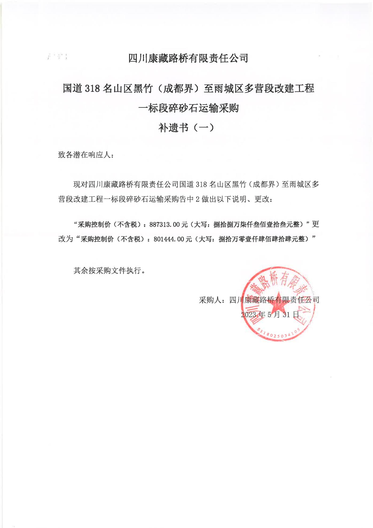 四川康藏路橋有限責(zé)任公司國道318名山區(qū)黑竹(成都界)至雨城區(qū)多營段改建工程一標段碎砂石運輸采購補遺書(一)