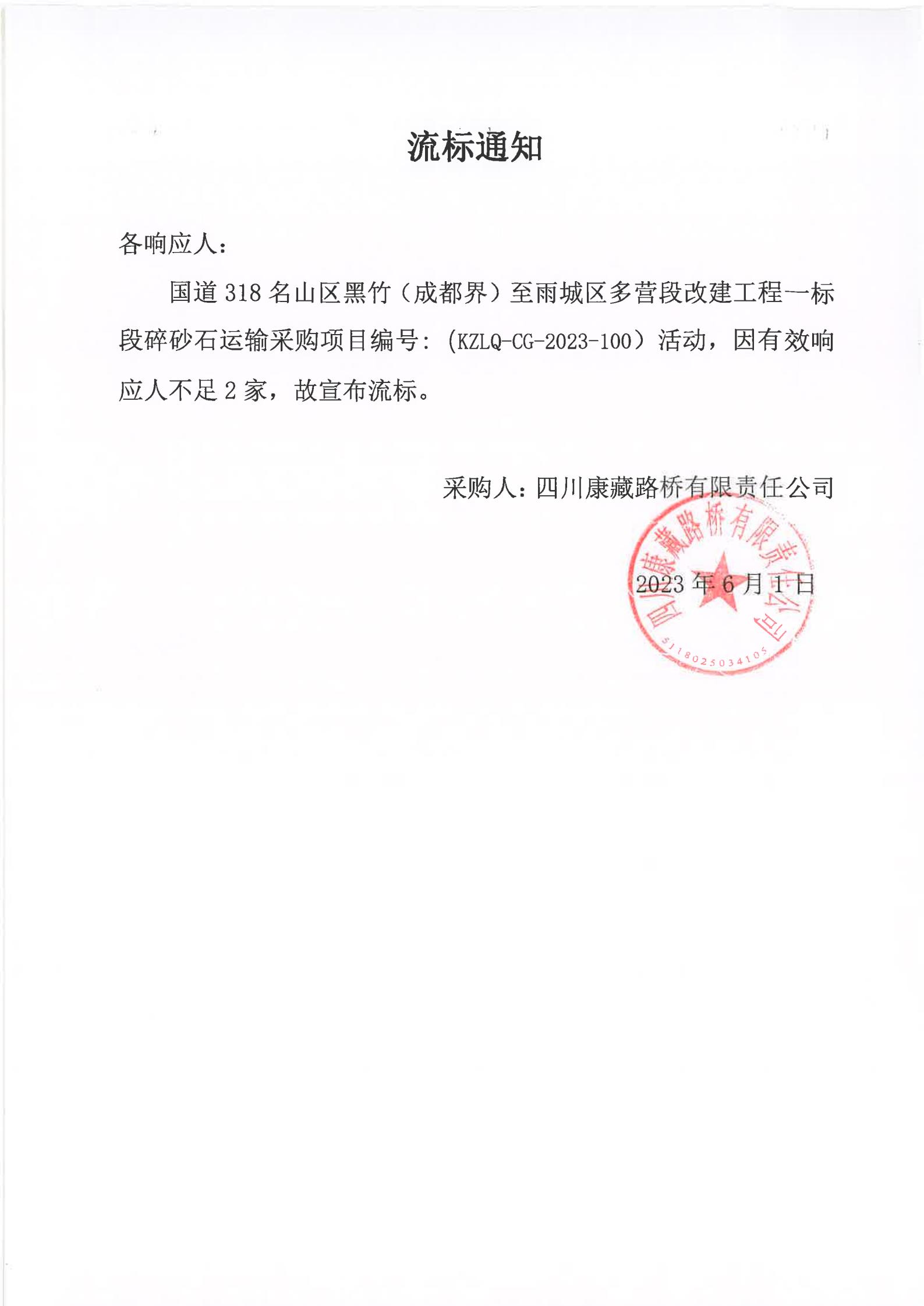 四川康藏路橋有限責(zé)任公司國道318名山區(qū)黑竹(成都界)至雨城區(qū)多營段改建工程一標段碎砂石運輸采購流標通知