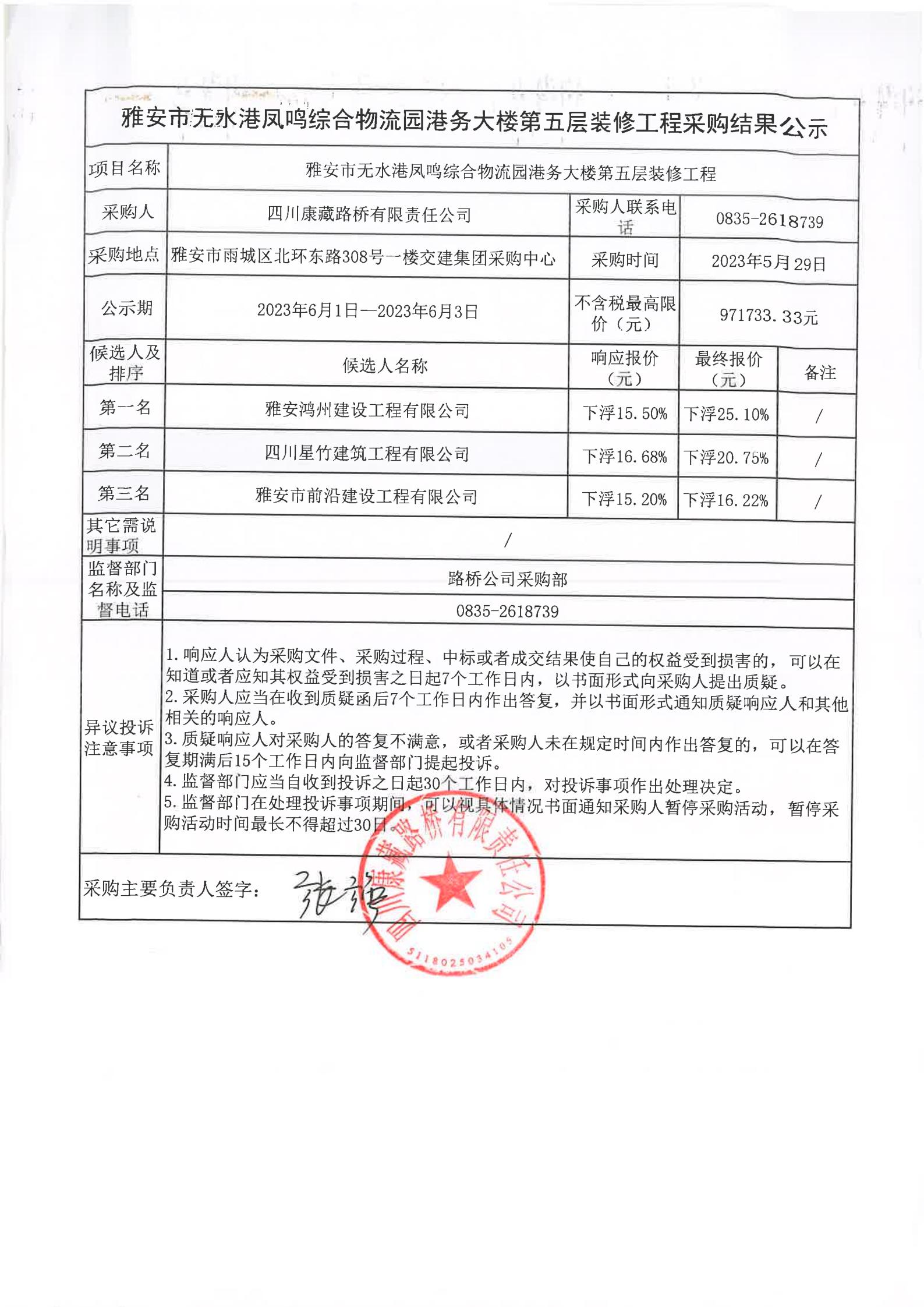 四川康藏路橋有限責任公司雅安市無水港鳳鳴綜合物流園港務大樓第五層裝修工程采購結(jié)果公示