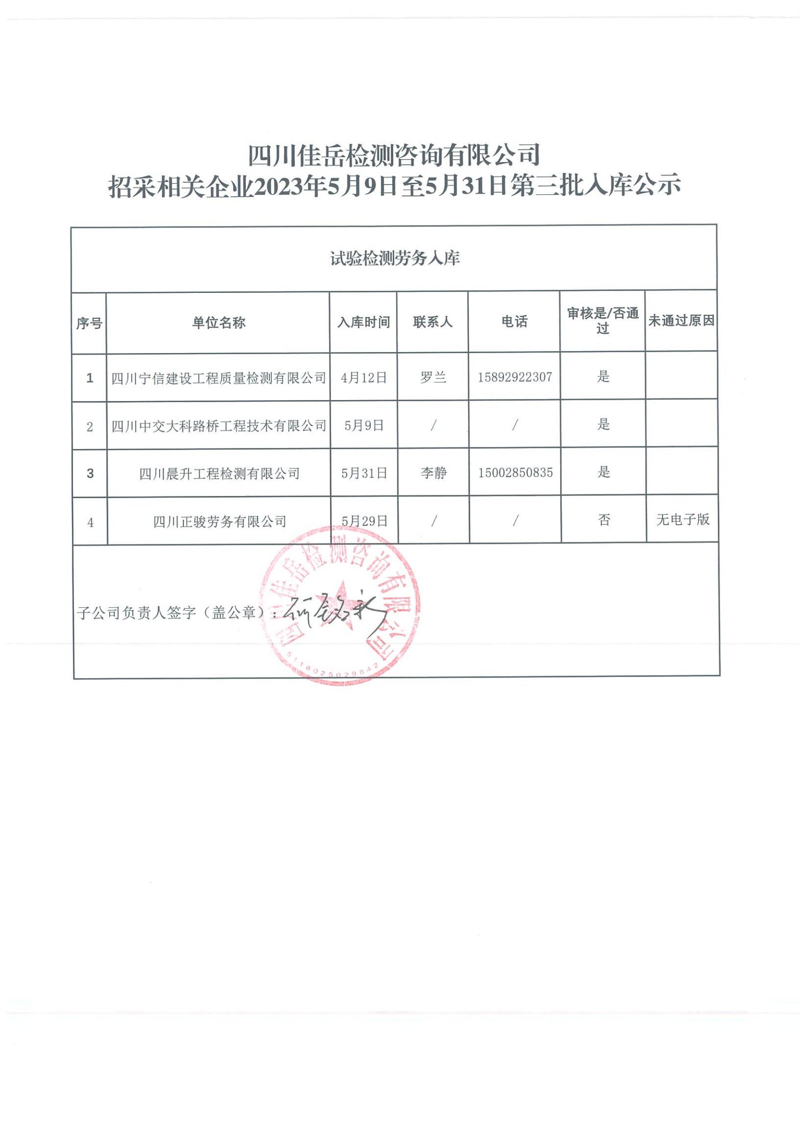 四川佳岳檢測咨詢有限公司(試驗檢測勞務供應商庫)2023年5月9日至5月31日第三批入庫結(jié)果公示