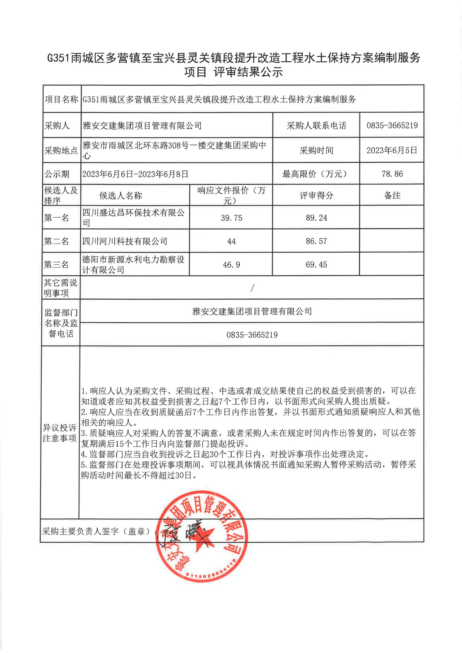 雅安交建集團項目管理有限公司G351雨城區(qū)多營鎮(zhèn)至寶興縣靈關鎮(zhèn)段提升改造工程水土保持方案編制服務項目評審結果公示