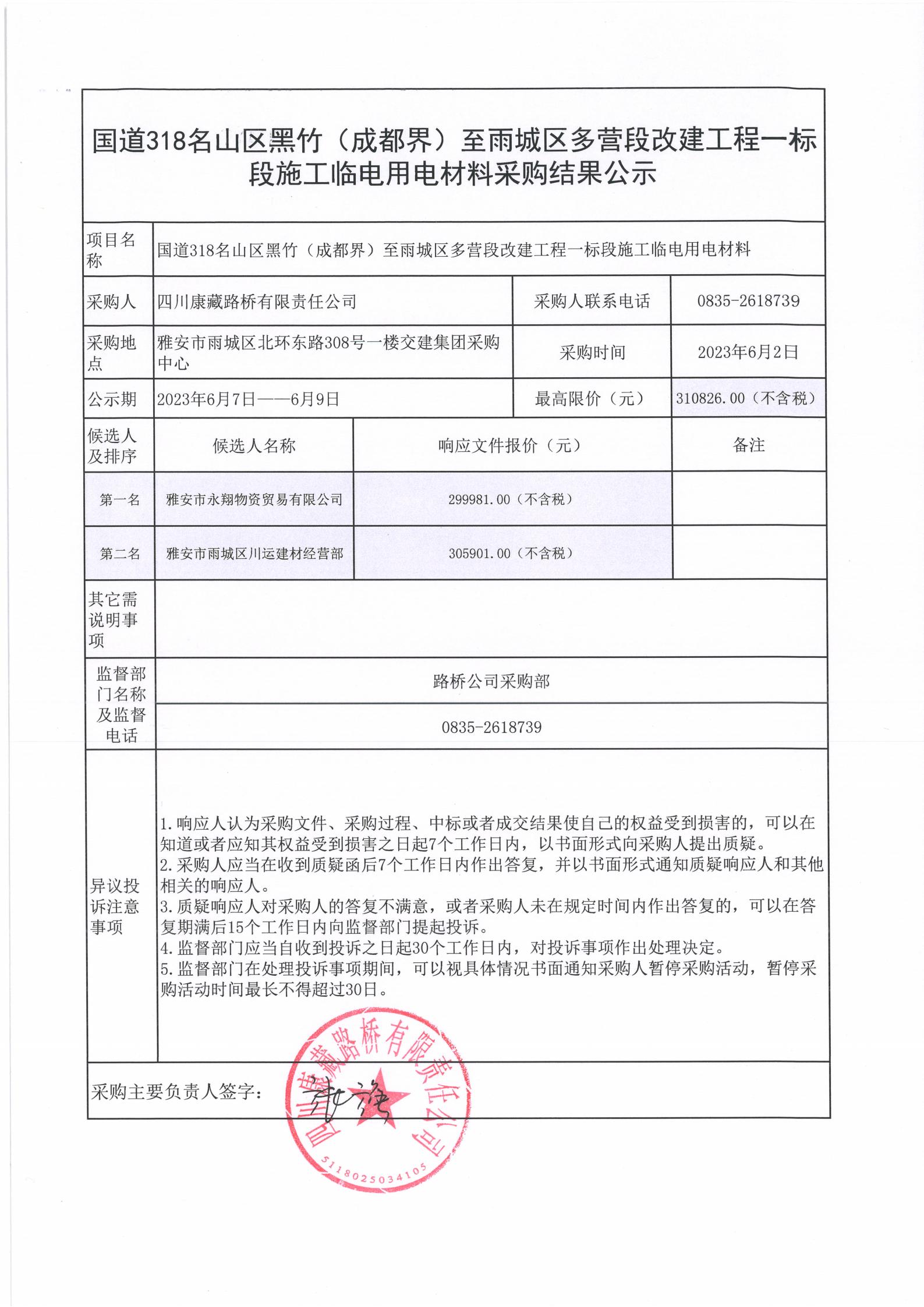 四川康藏路橋有限責任公司國道318名山區(qū)黑竹(成都界)至雨城區(qū)多營段改建工程一標段施工臨電用電材料采購結果公示