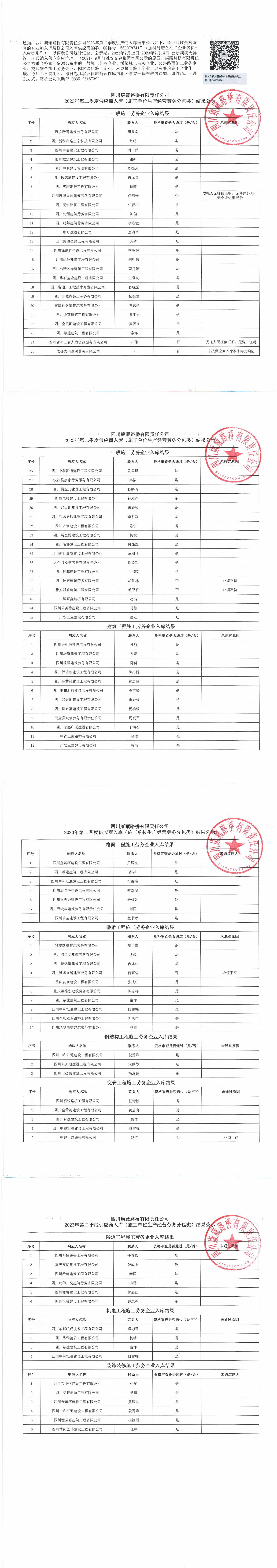 四川康藏路橋有限責(zé)任公司2023年第二季度供應(yīng)商入庫(kù)(施工單位生產(chǎn)經(jīng)營(yíng)勞務(wù)分包類(lèi))結(jié)果公示
