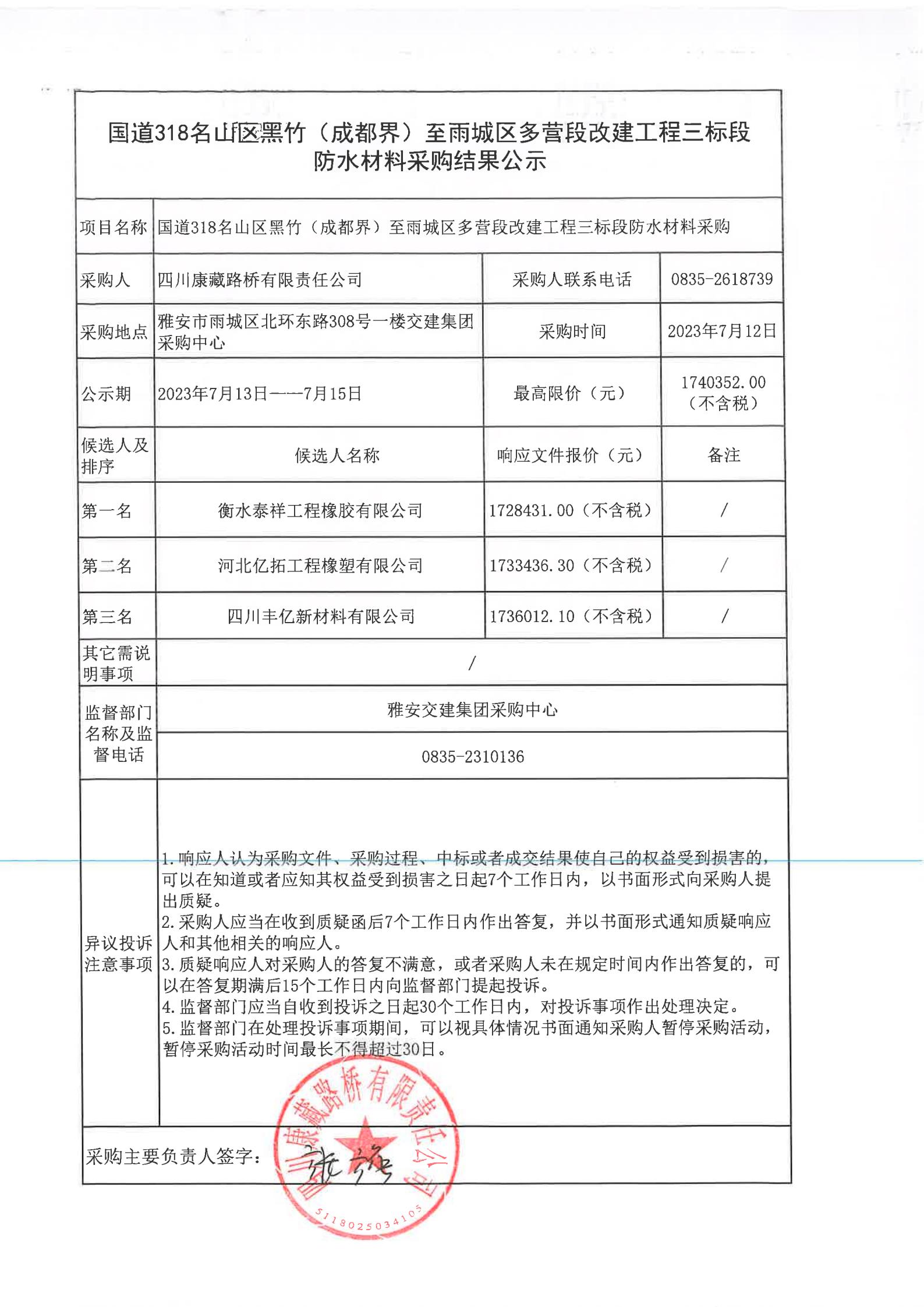 四川康藏路橋有限責(zé)任公司國道318名山區(qū)黑竹(成都界)至雨城區(qū)多營段改建工程三標段防水材料采購結(jié)果公示
