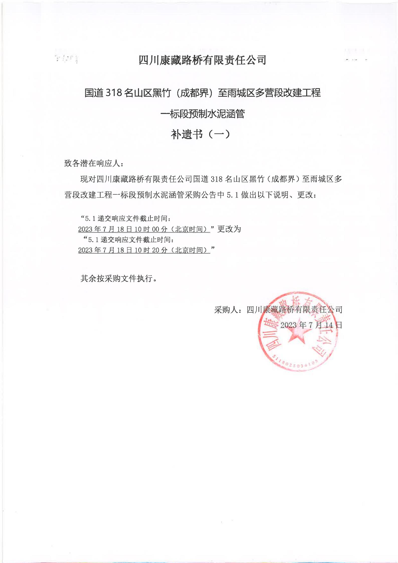 四川康藏路橋有限責(zé)任公司國道318名山區(qū)黑竹(成都界)至雨城區(qū)多營段改建工程一標(biāo)段預(yù)制水泥涵管(補(bǔ)遺書)(一)