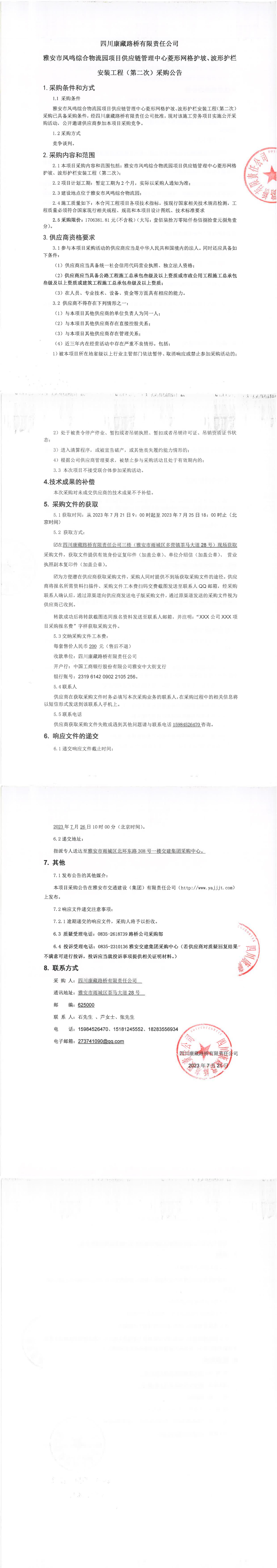四川康藏路橋有限責(zé)任公司雅安市鳳鳴綜合物流園項目供應(yīng)鏈管理中心菱形網(wǎng)格護(hù)坡、波形護(hù)欄安裝工程(第二次)采購公告