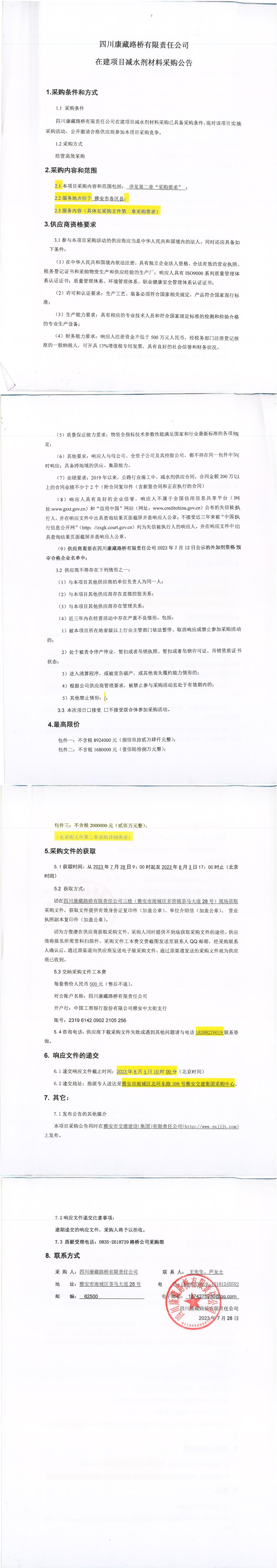 四川康藏路橋有限責(zé)任公司在建項(xiàng)目減水劑材料采購(gòu)公告