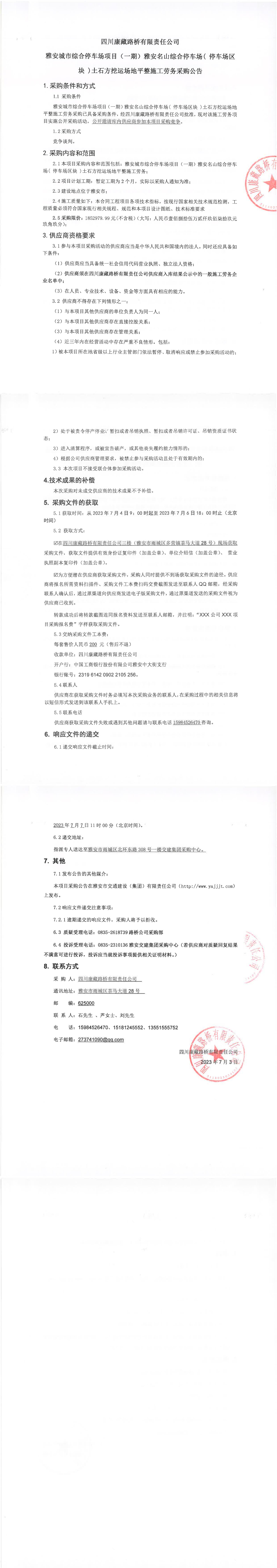 四川康藏路橋有限責(zé)任公司雅安城市綜合停車場(chǎng)項(xiàng)目(一期)雅安名山綜合停車場(chǎng)(停車場(chǎng)區(qū)塊)土石方挖運(yùn)場(chǎng)地平整施工勞務(wù)采購公告