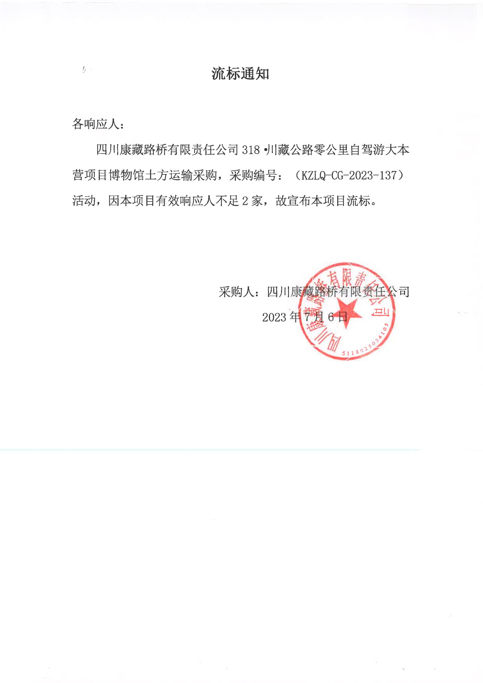 四川康藏路橋有限責(zé)任公司318·川藏公路零公里自駕游大本營項目博物館土方運(yùn)輸采購流標(biāo)通知