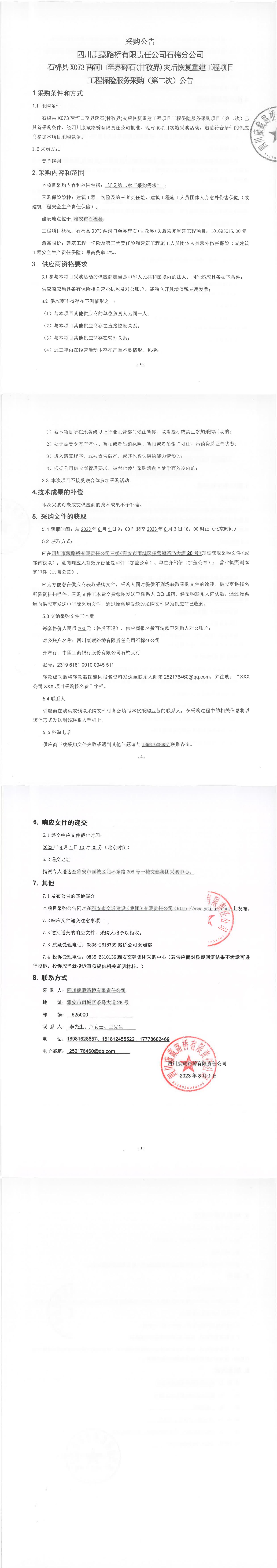 四川康藏路橋有限責任公司石棉分公司石棉縣X073兩河口至界碑石(甘孜界)災后恢復重建工程項目工程保險服務采購(第二次)公告