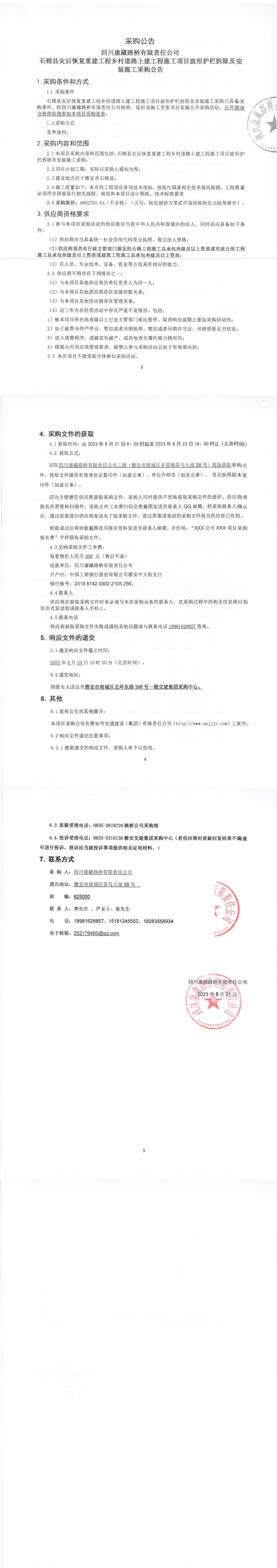 四川康藏路橋有限責任公司石棉縣災后恢復重建工程鄉(xiāng)村道路土建工程施工項目波形護欄拆除及安裝施工采購公告