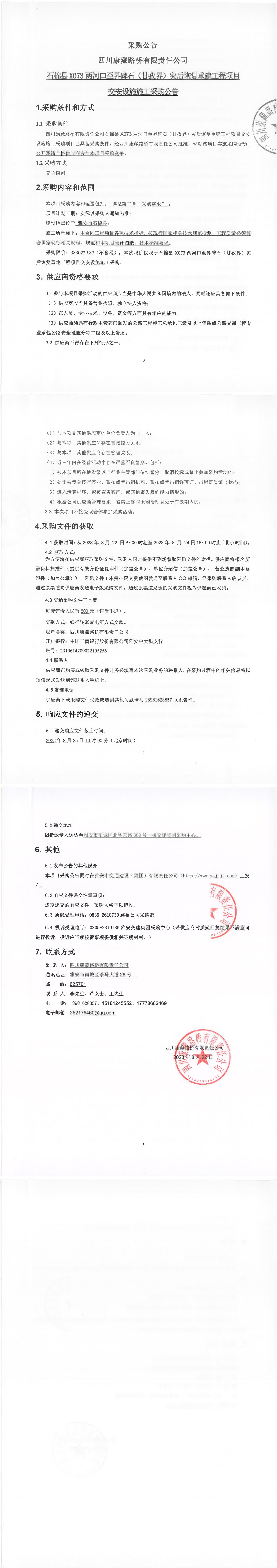 四川康藏路橋有限責(zé)任公司石棉縣X073兩河口至界碑石(甘孜界)災(zāi)后恢復(fù)重建工程項(xiàng)目交安設(shè)施施工采購(gòu)公告