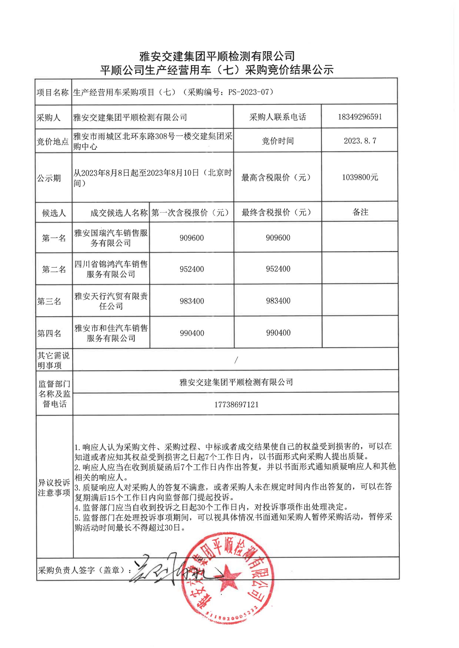 雅安交建集團平順檢測有限公司平順公司生產經營用車(七)采購競價結果公示