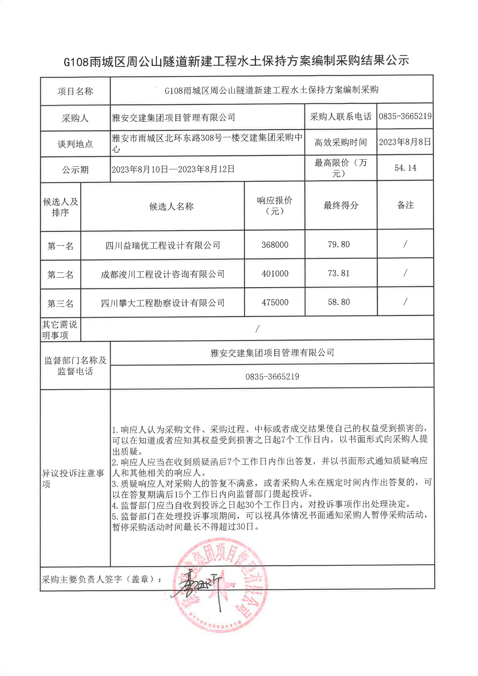 雅安交建集團項目管理有限公司G108雨城區(qū)周公山隧道新建工程水土保持方案編制采購結果公示