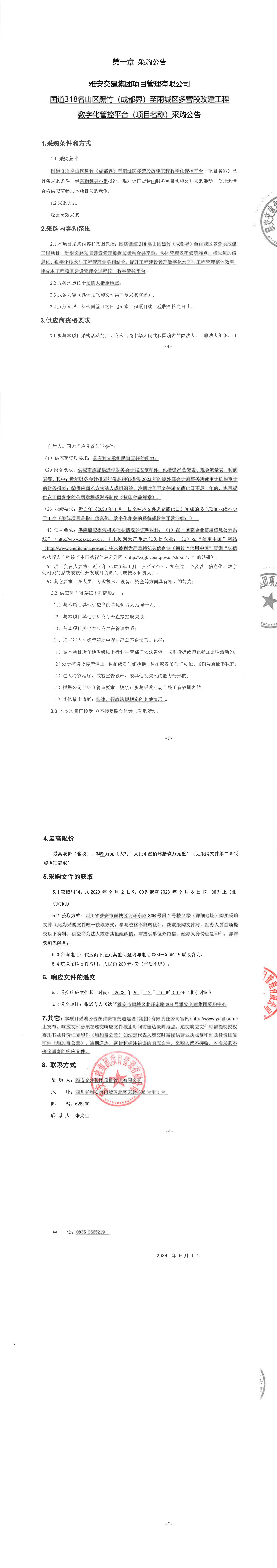 雅安交建集團(tuán)項(xiàng)目管理有限公司國道318名山區(qū)黑竹(成都界)至雨城區(qū)多營段改建工程數(shù)字化管控平臺(tái)(項(xiàng)目名稱)采購公告