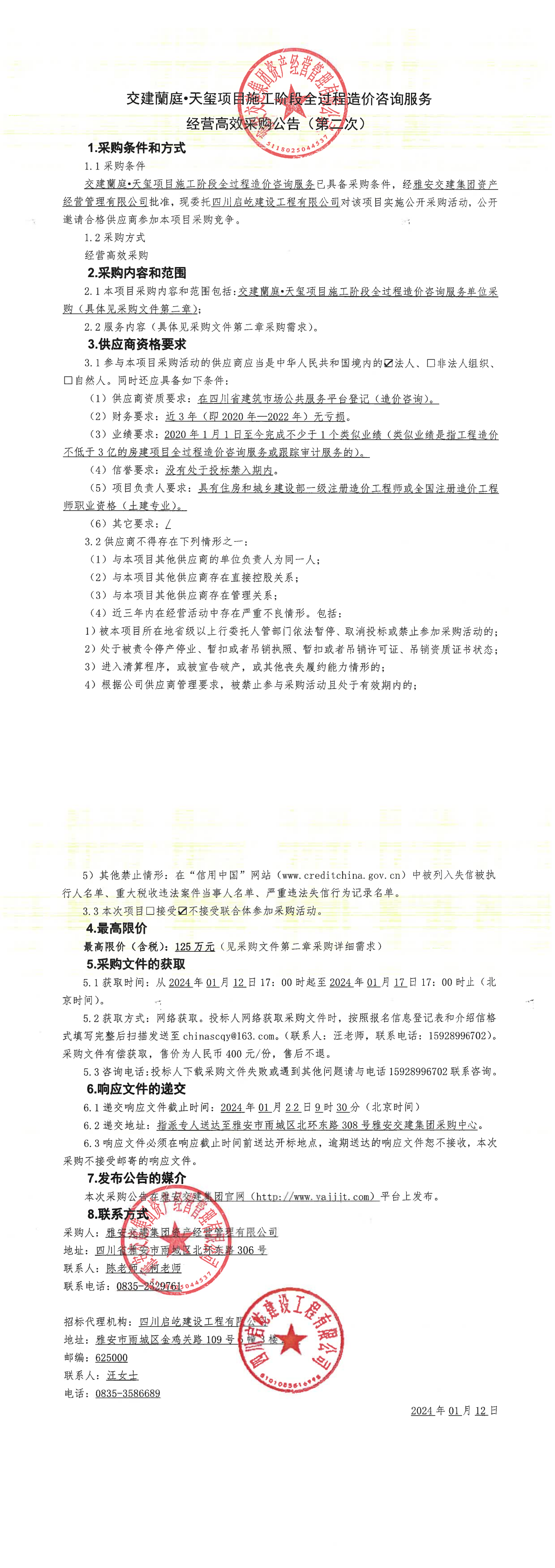 雅安交建集團(tuán)資產(chǎn)經(jīng)營管理有限公司交建蘭庭·天璽項(xiàng)目施工階段全過程造價(jià)咨詢服務(wù)經(jīng)營高效采購公告(第二次)
