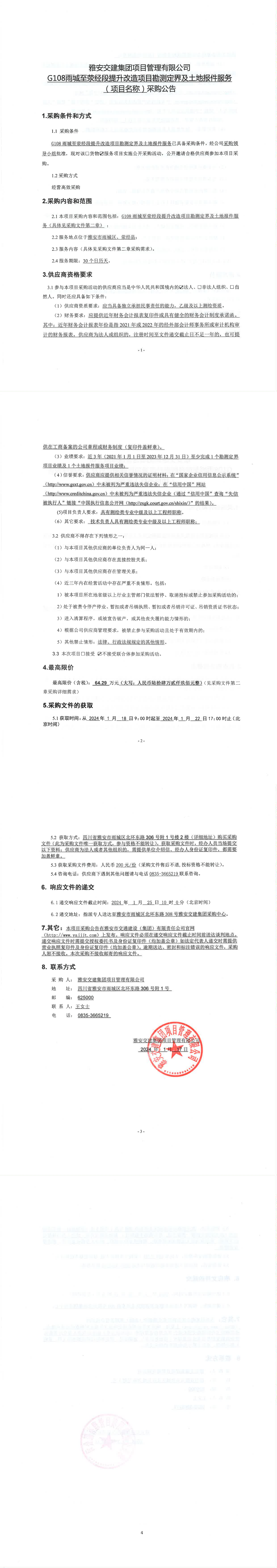 雅安交建集團項目管理有限公司G108雨城至滎經(jīng)段提升改造項目勘測定界及土地報件服務(wù)(項目名稱)采購公告
