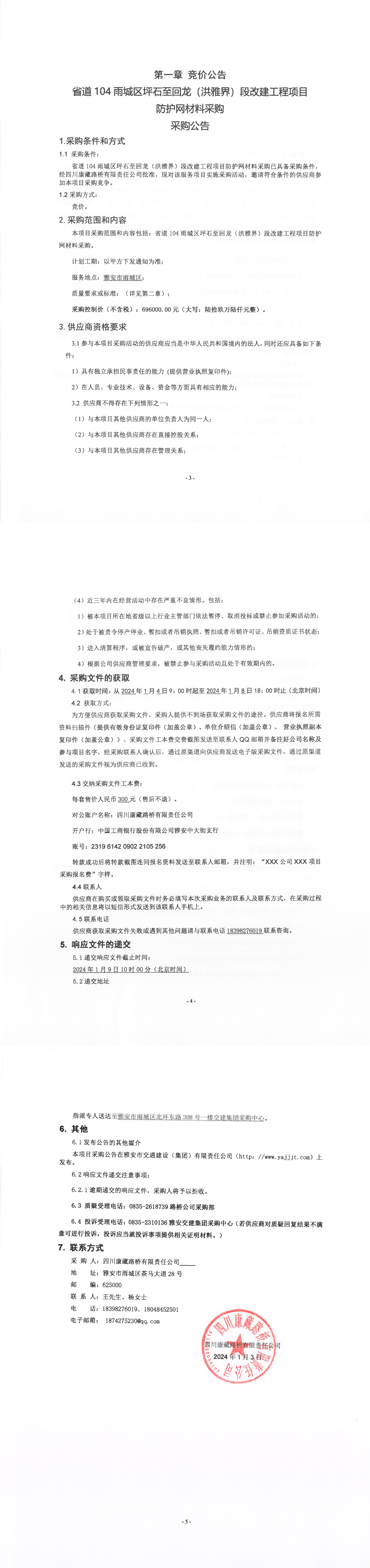 四川康藏路橋有限責(zé)任公司省道104雨城區(qū)坪石至回龍(洪雅界)段改建工程項目防護網(wǎng)材料采購公告
