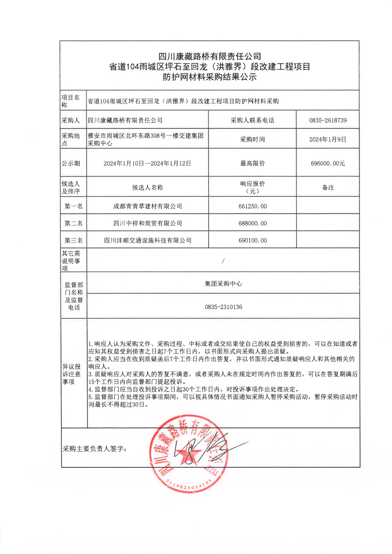 四川康藏路橋有限責(zé)任公司省道104雨城區(qū)坪石至回龍(洪雅界)段改建工程項(xiàng)目防護(hù)網(wǎng)材料采購結(jié)果公示
