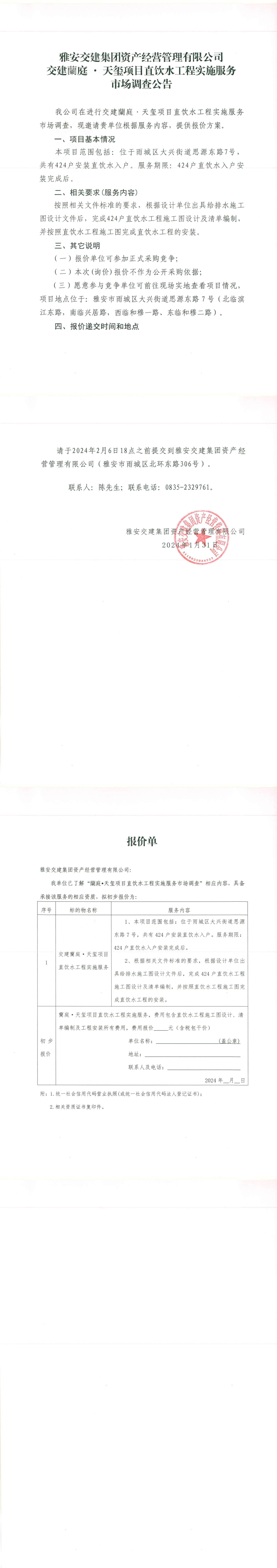 雅安交建集團資產(chǎn)經(jīng)營管理有限公司交建蘭庭·天璽項目直飲水工程實施服務市場調(diào)查公告
