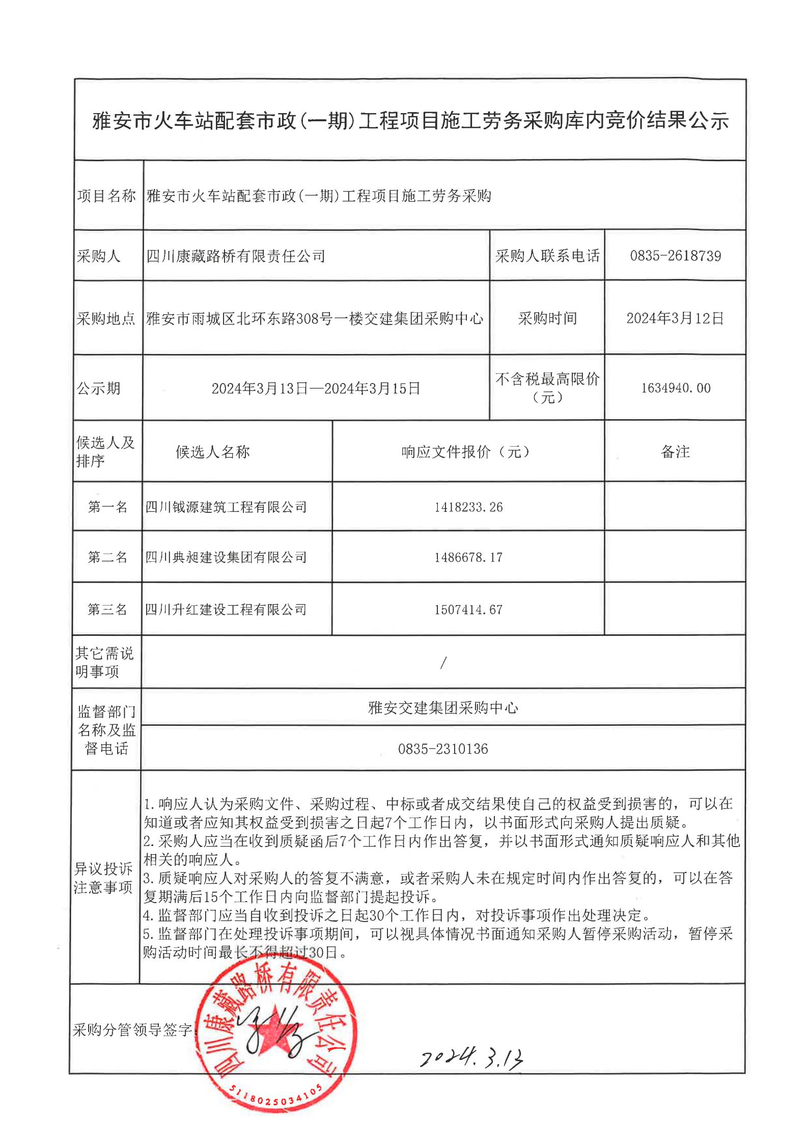 四川康藏路橋有限責任公司雅安市火車站配套市政(一期)工程項目施工勞務采購結果公示