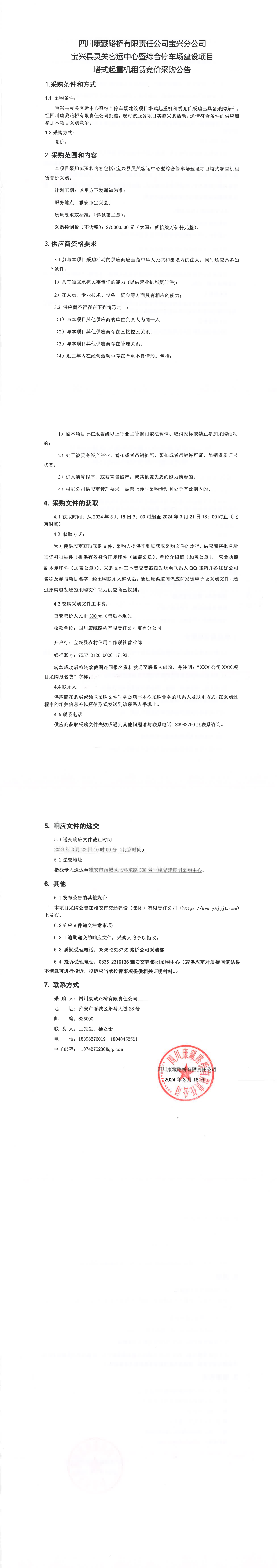 四川康藏路橋有限責(zé)任公司寶興縣靈關(guān)客運(yùn)中心暨綜合停車場(chǎng)建設(shè)項(xiàng)目塔式起重機(jī)租賃競(jìng)價(jià)采購公告
