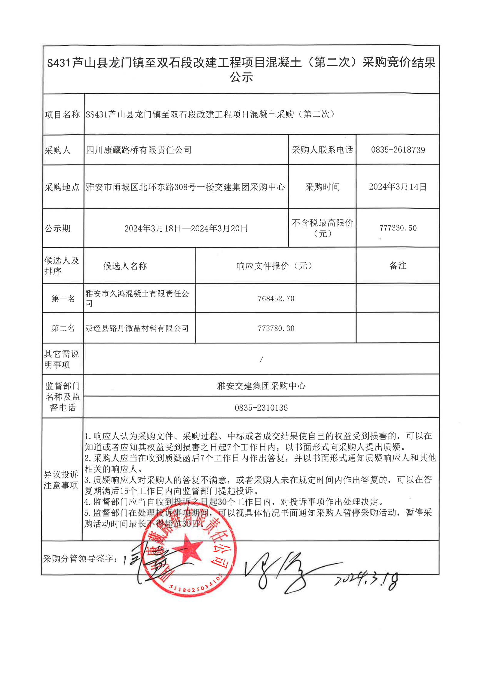四川康藏路橋有限責(zé)任公司S431蘆山縣龍門鎮(zhèn)至雙石段改建工程項(xiàng)目混凝土(第二次)采購競價結(jié)果公示