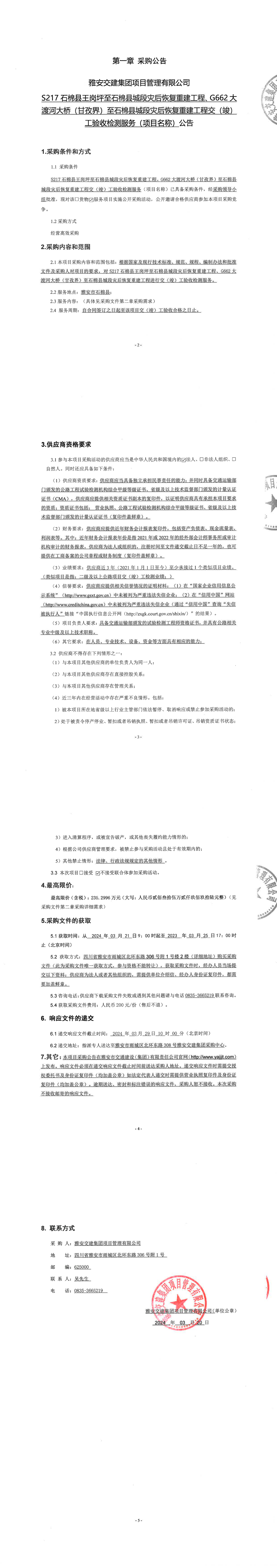 雅安交建集團項目管理有限公司S217石棉縣王崗坪至石棉縣城段災后恢復重建工程、G662大渡河大橋(甘孜界)至石棉縣城段災后恢復重建工程交(竣)工驗收檢測服務(項目名稱)公告