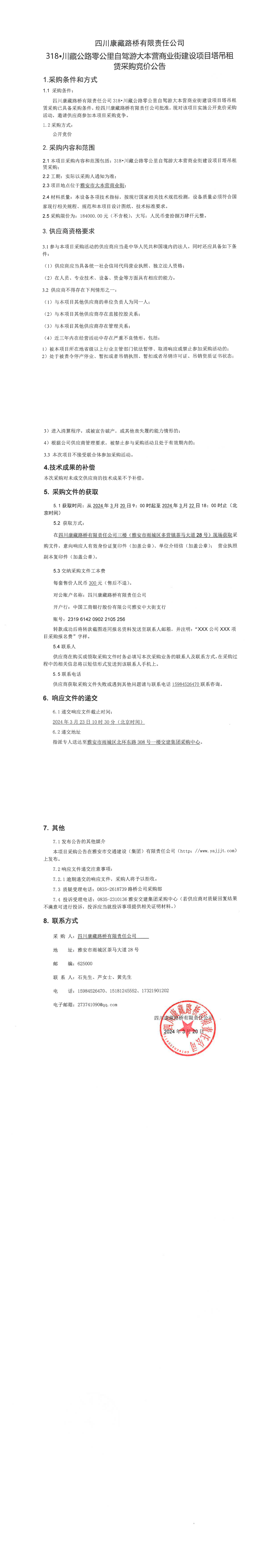 四川康藏路橋有限責任公司318·川藏公路零公里自駕游大本營商業(yè)街建設項目塔吊租賃采購競價公告