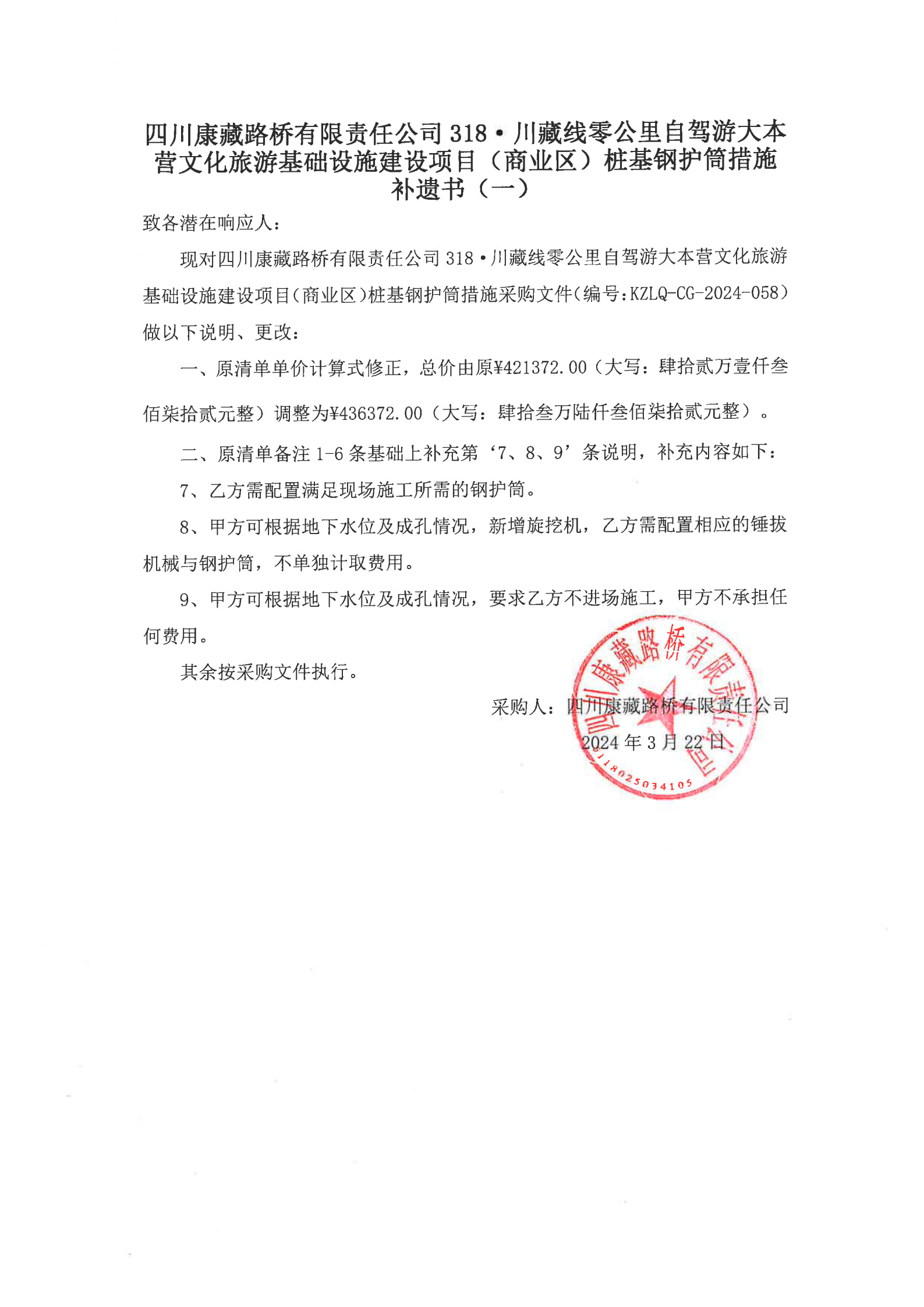 四川康藏路橋有限責(zé)任公司318·川藏公路零公里自駕游大本營(yíng)文化旅游基礎(chǔ)設(shè)施建設(shè)項(xiàng)目(商業(yè)區(qū))樁基鋼護(hù)筒措施補(bǔ)遺書(shū)(一)