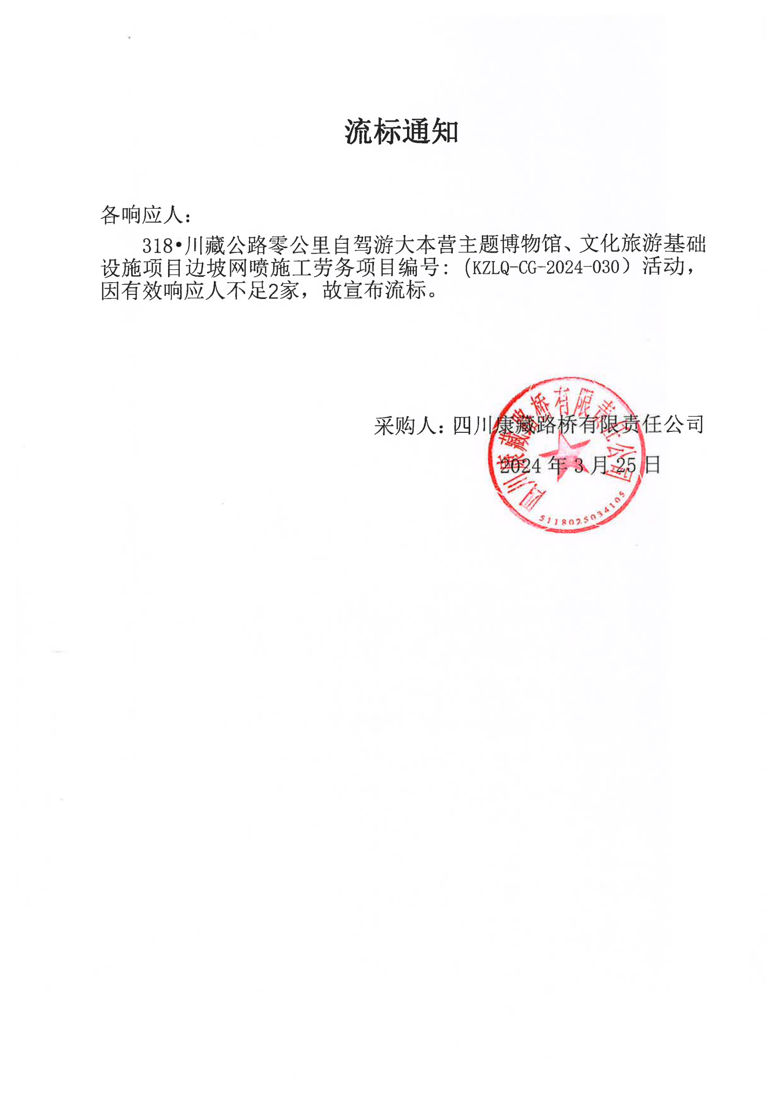 四川康藏路橋有限責任公司318·川藏公路零公里自駕游大本營主題博物館、文化旅游基礎設施項目邊坡網(wǎng)噴施工勞務流標通知