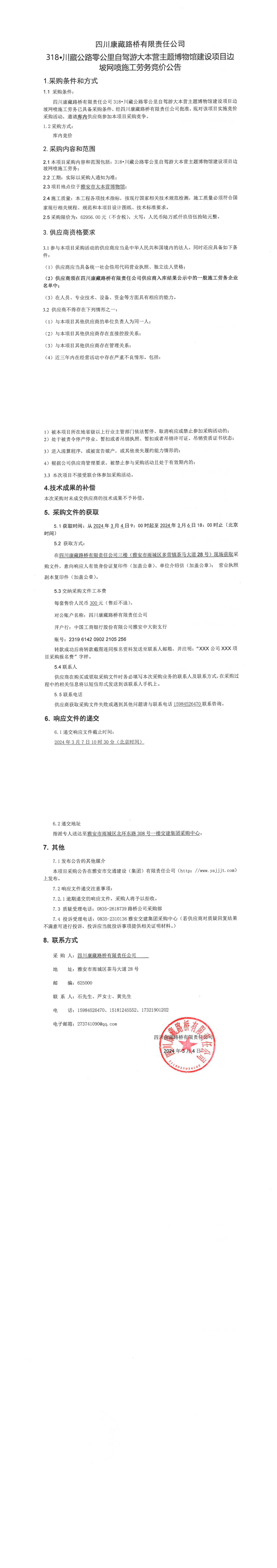 四川康藏路橋有限責任公司318·川藏公路零公里自駕游大本營主題博物館建設項目邊坡網噴施工勞務競價公告