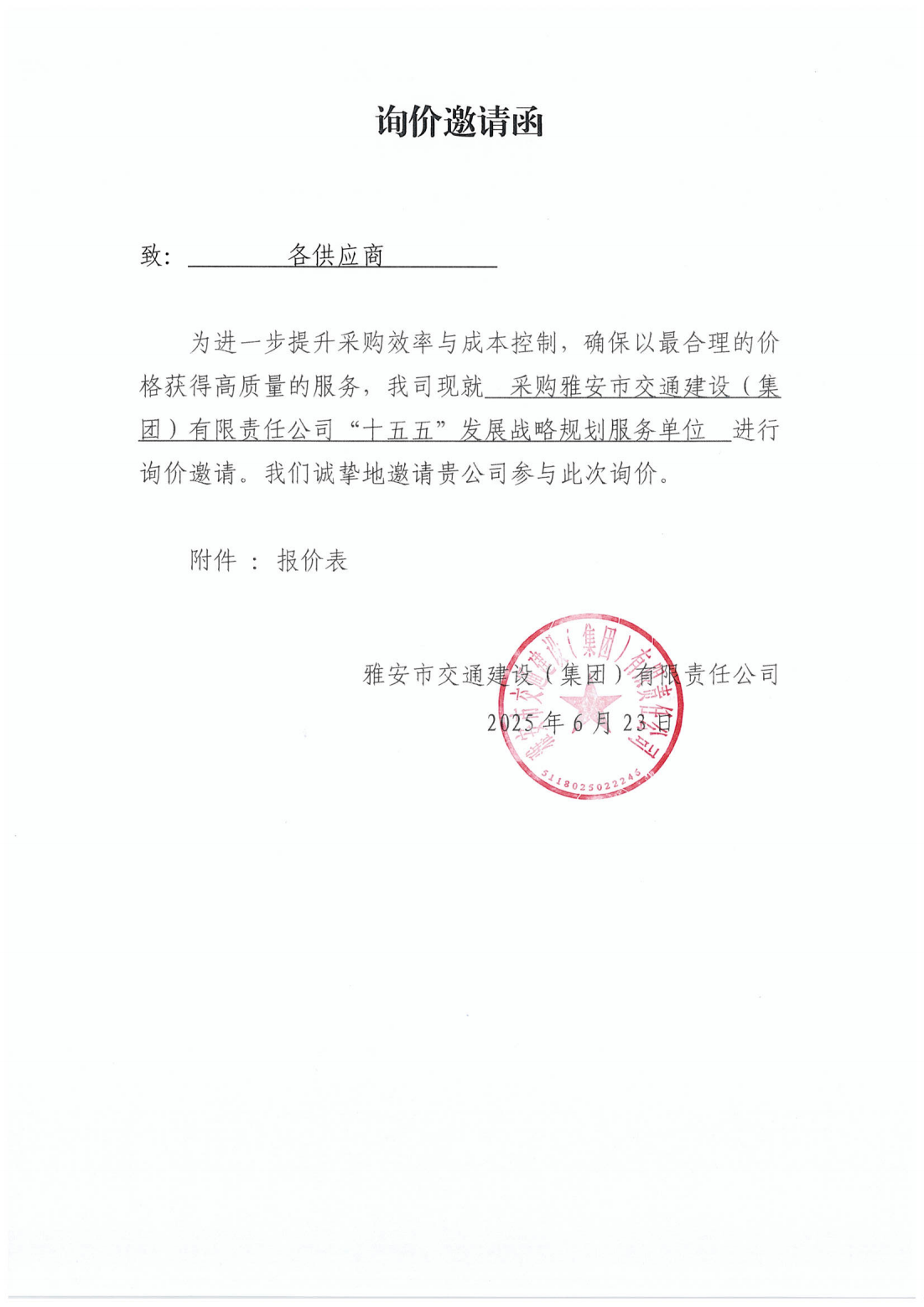 關(guān)于采購(gòu)雅安市交通建設(shè)(集團(tuán))有限責(zé)任公司“十五五”發(fā)展戰(zhàn)略規(guī)劃服務(wù)單位的詢價(jià)