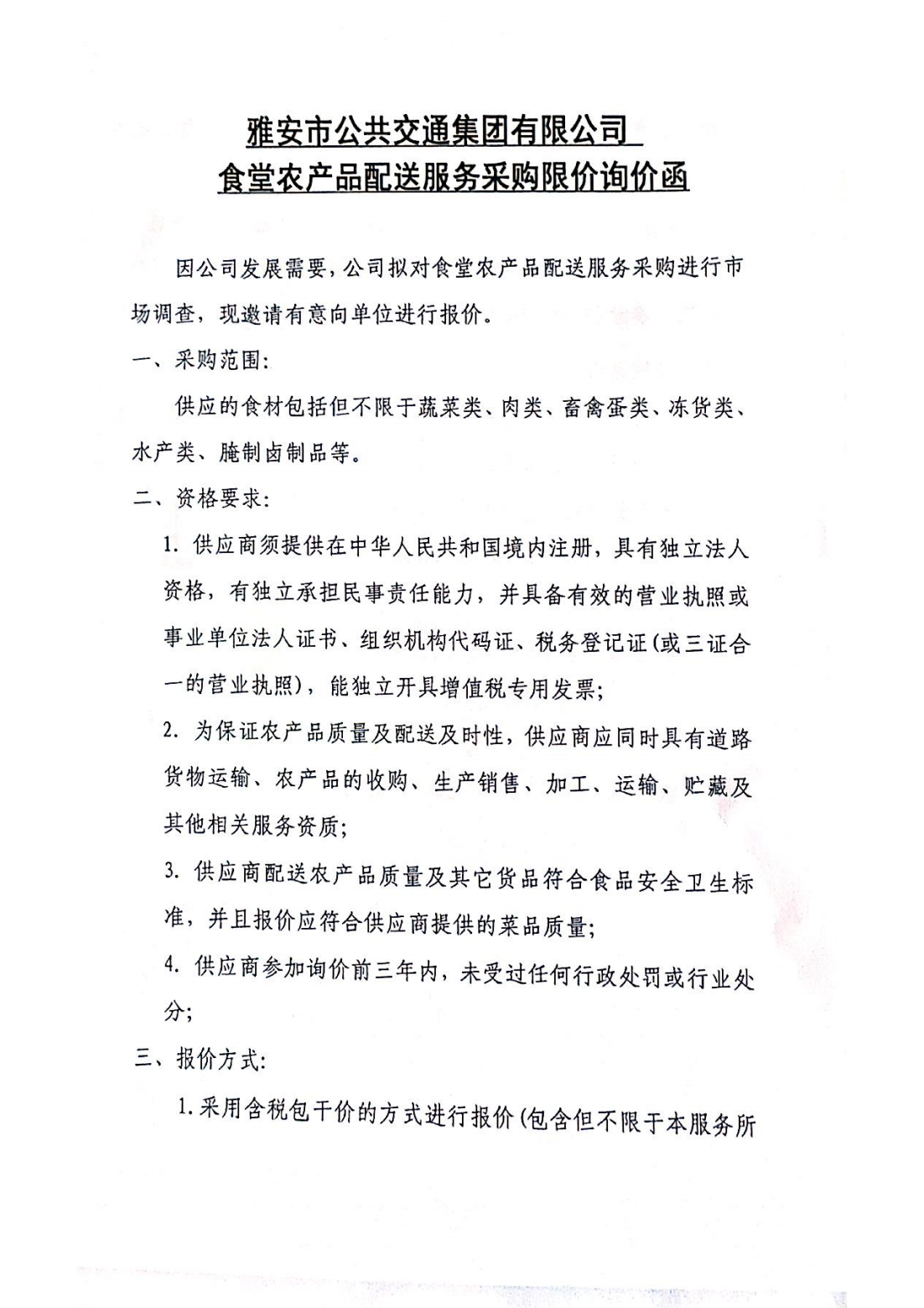 關(guān)于雅安市公共交通集團(tuán)有限公司食堂農(nóng)產(chǎn)品配送服務(wù)采購(gòu)限價(jià)的詢價(jià)函